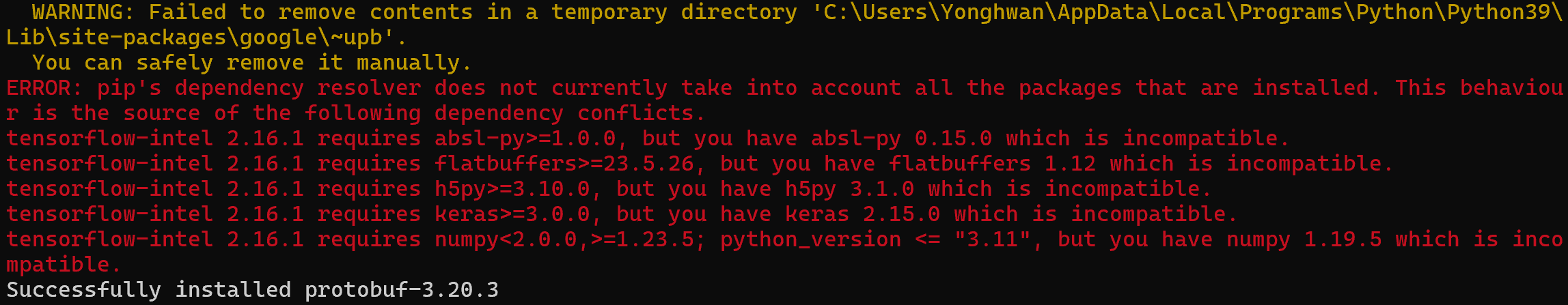 뭔가 노란색 글씨도 있고 ~ 빨간색 글씨도 있는데 뭐 protobuf만 성공적으로 설치되면 된거 아니겠습니까?